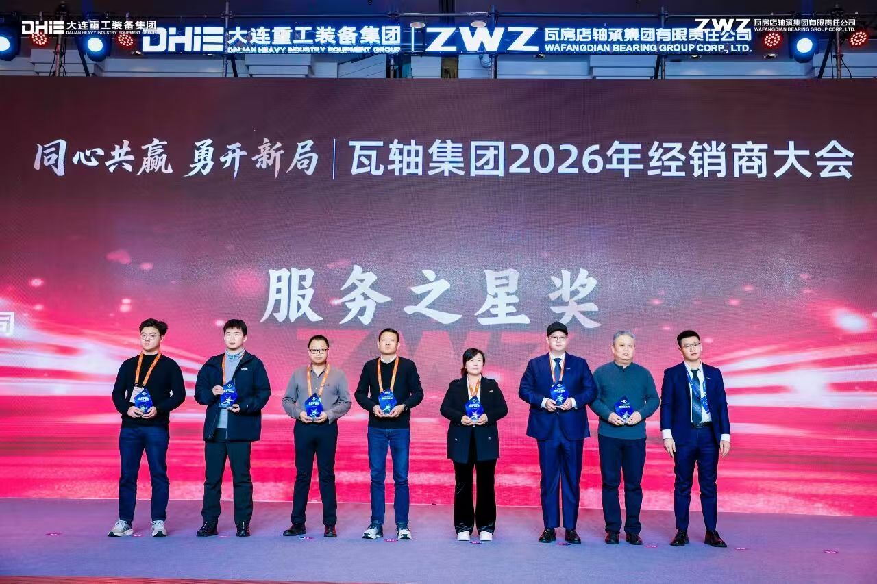 12月10日,以“同心共赢 勇开新局”为主题的瓦轴集团2026年经销商大会于大连香格里拉酒店隆重举行。瓦轴集团领导与来自全国各地的经销商代表齐聚一堂,共商合作,共绘高质量发展新蓝图。作为ZWZ轴承的长期授权经销商,杭州万马轴承有限公司应邀出席此次盛会,并凭借卓越的市场服务表现,荣膺大会颁发的“服务之星奖”。