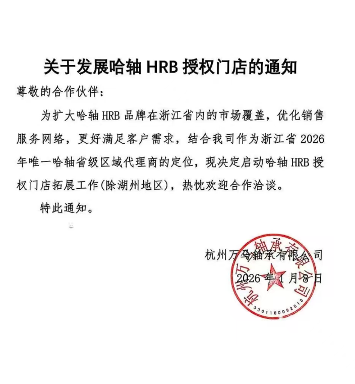 关于发展哈轴HRB授权门店的通知